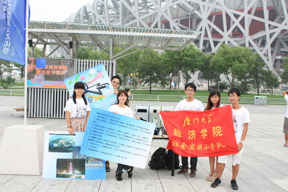 本次活动经北京奥林匹克公园管委会批准,北京市朝阳区志愿者协会督导与协助,由厦门大学经济学院统计系络比邻实践队6名队员王秉权、栗辰、马睿、虞娅雅、石磊、吴成彬实际承办。实践队队员九点半来到奥林匹克公园开始了紧张的布置工作。公益活动地点在鸟巢与水立方之间的公园主干道天辰东路东侧路旁,临近鸟巢A入口,距水立方一百米左右距离,是人流量相对较大的区域。队员们选好地点后,在公园内朝阳区志愿者的帮助下借用到桌椅,搭好拼图展板,挂好实践队队旗便开始了公益活动。为了使活动轻松有趣而不是单纯地说教,实践队自行设计了以奥林匹克公园内景观为图案的拼图,邀请路过游客进行拼图游戏并阅读文明旅游小贴士展板。同时实践队队员向热情参与活动的游客赠送了队员自制的厦门大学漳州校区风景明信片,并鼓励游客利用社交网络工具,如微博等,发布状态温情提示亲朋好友在国内出行时文明旅游,方便他人。