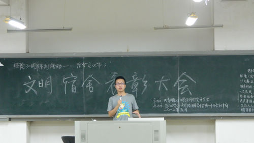 大会共有五个环节。经济学院团委学生会主席刘洋首先上台讲话。他对大家一直以来对自律部工作的支持表示感谢并希望大家今后继续关注并积极参与自律部开展的活动。随后,主持人李博文为大家播放了两段视频,分别为此次评出的文明宿舍与宿舍美化大赛获奖宿舍的照片剪辑,精美的剪辑勾起了在座同学们美好的回忆。此后,获奖宿舍代表——博学二301的宿舍长10级金融系张炳盛同学上台进行了经验交流,他先分享了一些宿舍生活照,还强调宿舍成员相处最重要的是互相尊重与适当包容。张炳盛同学发言完毕后是最激动人心的颁奖环节,每个系的文明宿舍和特色宿舍获奖代表上台从主席刘洋和自律部常务副部杨云妮手中接过属于他们的荣誉,他们的脸上都洋溢着激动和喜悦。最后,自律部代表李斯蕴对宿舍文化节作了总结,为此次表彰大会画上了一个圆满的句号。