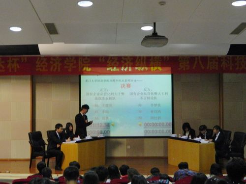 来自经济学院和人文学院的“流氓凑表链”队作为正方支持观点:“国有企业私营化利大于弊”,来自经济学院和化学与化工学院的“不言”队作为反方支持观点:“国有企业私营化弊大于利”。在各组队员进行自我介绍后,比赛正式开始。双方队员针锋相对,你来我往却又不失风度,双方在私营化的定义上进行了激烈的口角。整场比赛精彩纷呈,观众听得兴趣盎然,报以阵阵掌声。辩论结束后,由选手来回答观众的疑惑。随后,到场嘉宾作了一番画龙点睛的点评,赛事主席宣布反方“不言”队获得冠军,正方三辩周愚获得最佳辩手。