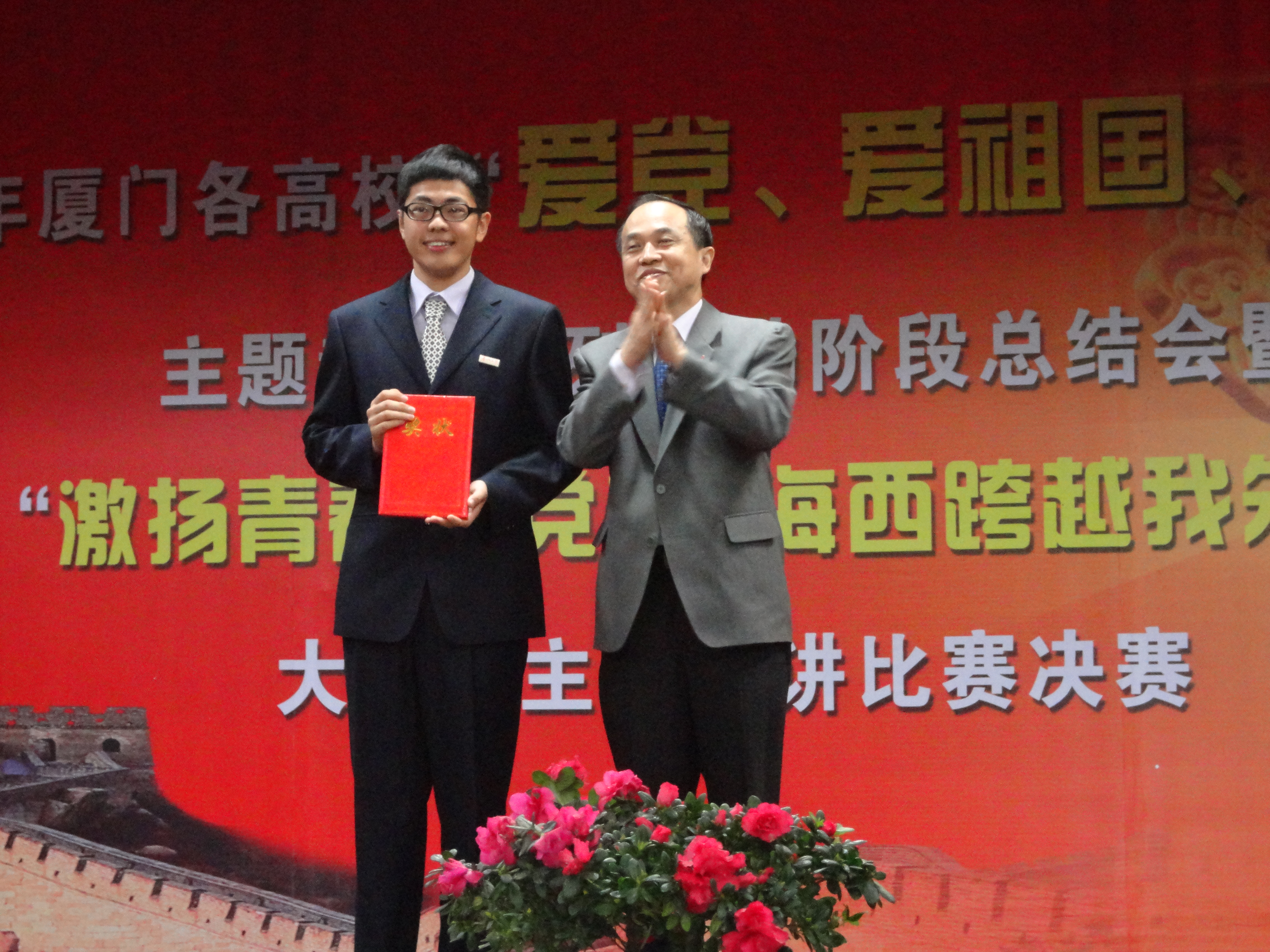 12月10日,2011年厦门各高校“三爱”主题教育系列活动阶段总结会暨大学生演讲比赛决赛在南洋职业学院举行。本次演讲比赛的主题是“激扬青春跟党走,海西跨越我先行”。经过三个多月的角逐,共有9位同学代表各自学校来参加本次决赛。代表我校参赛的是来自经济学院国际经济与贸易系2009级本科的高珩同学。