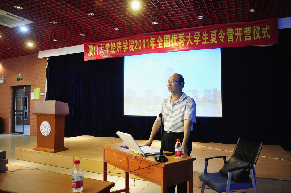 7月15日上午,经济学院2011年全国优秀大学生夏令营系列讲座第一讲在厦门大学自钦楼多功能厅举办。讲座主题为《关于人民币汇率变动的若干问题》,由厦门大学经济学院副院长、金融学教授朱孟楠主讲。讲座围绕当前国际金融市场和汇率制度改革热点问题展开,从宏观经济形势和微观企业运转角度分析了人民币汇率变动的若干问题。讲座以翔实的数据、丰富的图表和触类旁通的案例、幽默风趣的语言,赢得了在场营员们的阵阵欢笑和掌声。讲座由经济学院党委副书记王艺宏主持。
