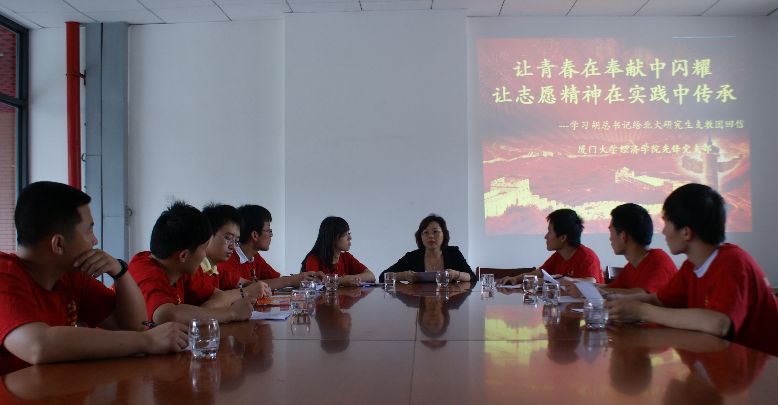 “经过支教扶贫实践,你们丰富了阅历、磨练了意志、增长了才干……这是促进青年学生向实践学习,向人民群众学习的有效形式。”5月10日,中共中央总书记、国家主席、中央军委主席胡锦涛给北京大学第十二届研究生支教团成员回信,对支教队员们无私奉献、践行志愿的精神给予了充分肯定并提出更高要求,对广大青年学子提出殷切希望。为深入学习回信的重要精神,厦门大学经济学院志愿先锋党支部于5月25日中午在自钦楼二楼会议室召开以“让青春在奉献中闪耀,让志愿精神在实践中传承”为主题的民主生活会。厦门大学校团委副书记陈雪玲、组织部部长孙佳出席了会议并发表讲话。