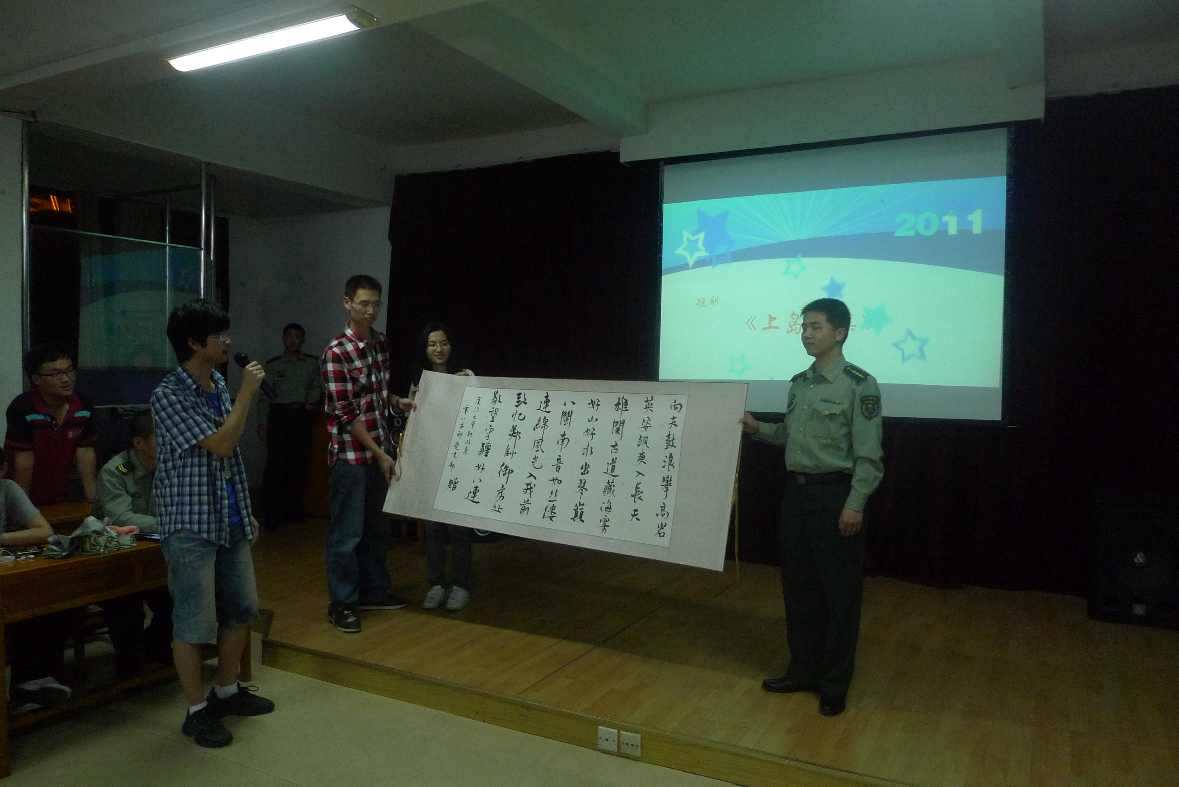 别开生面的联谊活动拉开序幕。学生党员们以精彩纷呈的歌唱舞蹈、器乐演奏、话剧小品等节目展现当代大学生朝气蓬勃的精神风貌,八连战士也纷纷亮出绝活——快板、小提琴、葫芦丝、竹笛,高昂奋进的军歌,风趣幽默的单口相声,博得学生党员们阵阵掌声。两个互动小游戏更是将晚会气氛推向了最高潮。临近尾声,财政系2008级党支部代表向“好八连“官兵赠送了一副原创诗词: