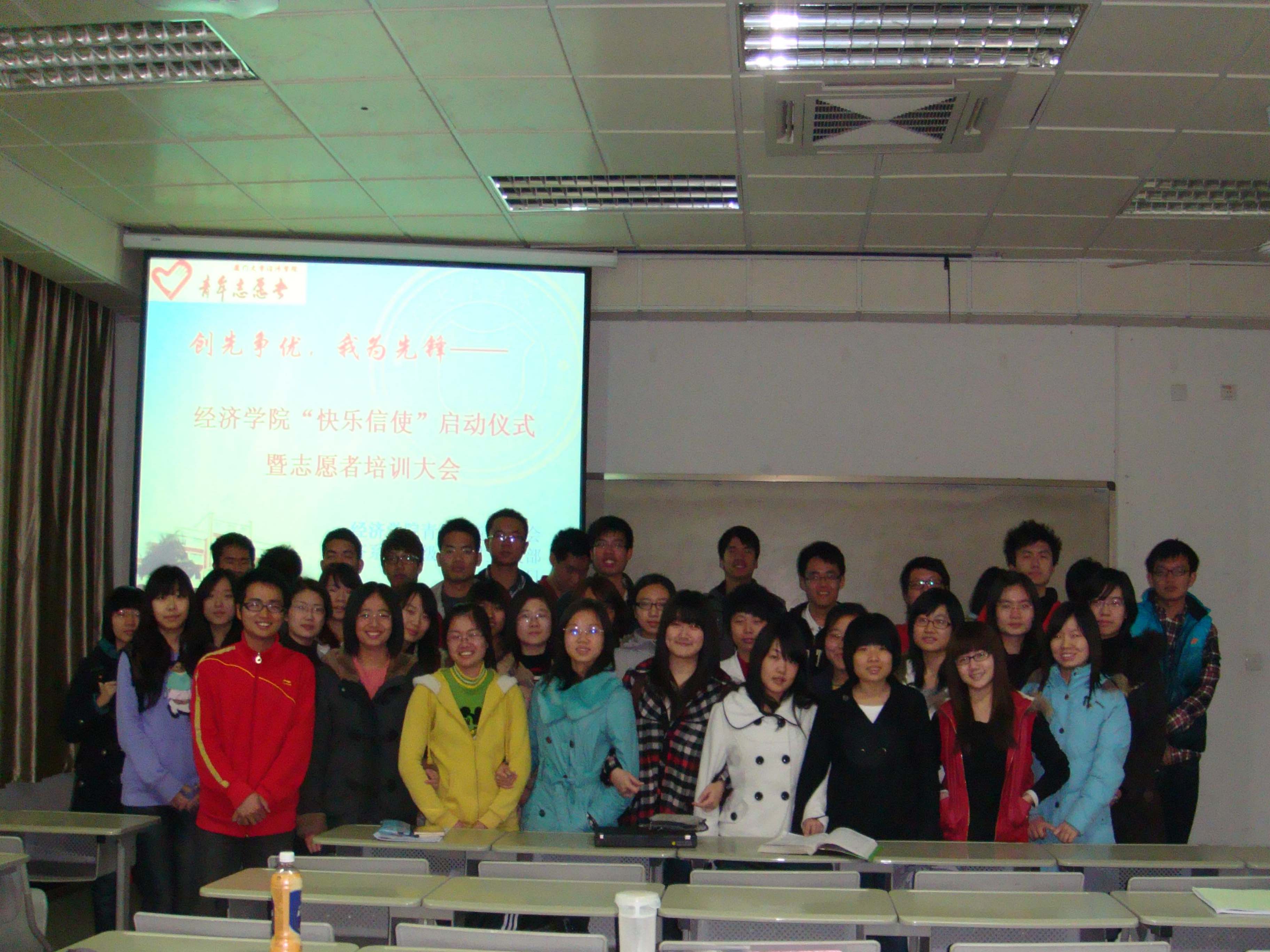3月24日晚,经济学院“快乐信使”活动启动仪式暨志愿者培训大会在本部嘉庚五101教室顺利召开。参加本次大会的主要有院团委青年志愿者协会主要干部、经济系2008级本科生党支部主要骨干及全体志愿者。