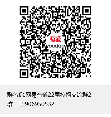 2、加入QQ群号【906950532】:网易有道22届校招交流群2,进行沟通答疑