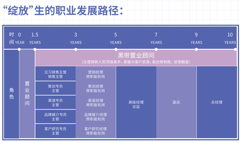 注:绽放生的初始岗位为置业顾问,你们需要在这个岗位上深刻了解客户、市场、竞争、行业特征以及营销这个职能。在初期的几年内,你们多数将在销售及销售管理方向发展,但不排除小部分人往策划推广、市场调研、媒体关系、公司品牌等方向发展。