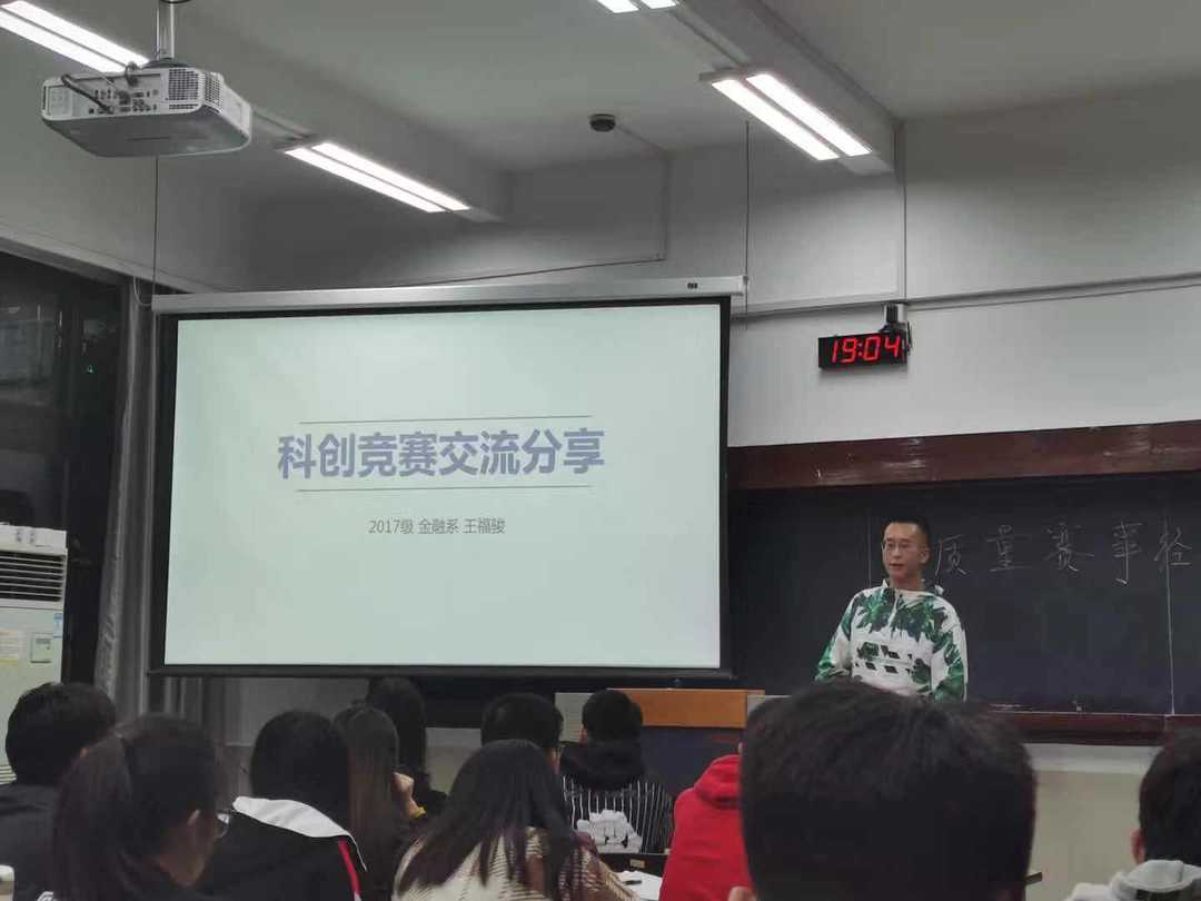 接下来,经济学院2017级金融国际班的王福骏为大家分享科创赛事的经历经验。他以自己在普华永道会计师事务所的面试问题为引,与大家分享创新创业赛事具有什么意义,会带来怎样的收获,并对比分析了各类赛事的特点,优劣,针对性地提出各类建议。同时,他详细讲述了自己参加创新创业赛事的故事,加深了大家对于创新创业赛事的了解。